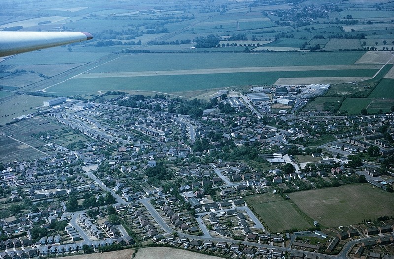 Bowing no doubt to economic pressures Airtech Ltd. made one of the more obvious changes to Haddenham Airfield in 1975 when it ploughed up all but a 1000 x 100 yard strip of the field for crops. This strip is what the Trust used until 2008, having access from the hangar via the old perimeter track once used by the motorcycle racers. This shot was taken from a Bergfalke II glider in 1978. |