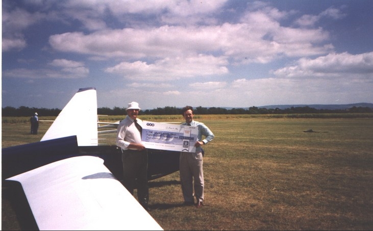 The Upward Bound Trust was, and still is, a unique organisation in Britain and so has always had to rely on funds donated by others to keep going. By the middle of the 1990’s it was obvious that the gliding world was leaving the Trust behind with most clubs having training gliders of glass and carbon fibre construction just like the fast competition single-seaters that would race over Haddenham in great gaggles on any summer afternoon. So it was decided that a major fund-raising campaign would have to be started in order to buy more relevant training machines, the AS K-13 being the preferred choice. The advent of the National Lottery released large amounts of ‘official’ funds and so an application to the National Lottery Sports Fund for £28,200 was made in 1995. The following year it was learnt that the Trust had been successful in its bid and so shortly afterwards two K-13’s were purchased, one from Essex and one directly from Germany. John Concannon, Chairman of UBT, receives a cheque for £28,200 from the National Lottery Sports Fund in July 1996. They are standing beside the Trusts first K-13. |